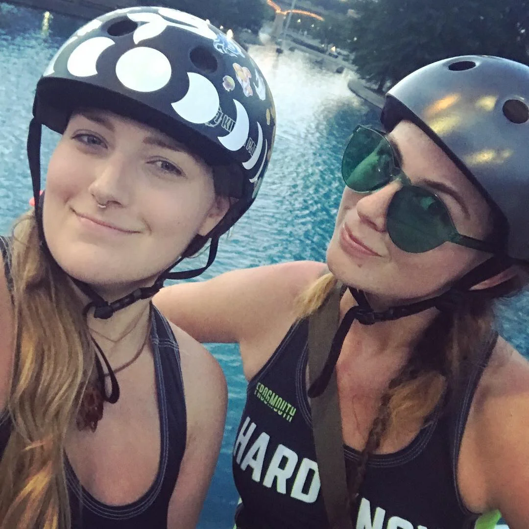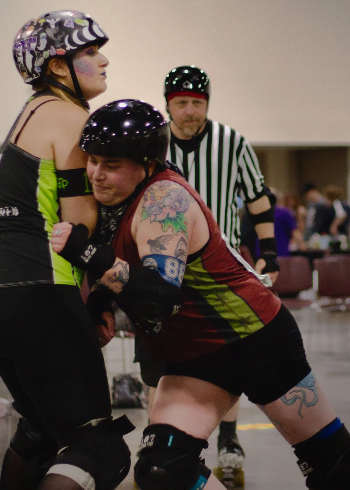 I’ve been playing sports since I could run. I played soccer for 6 years, basketball for a year, coed football for a year (that was my favorite until they took away the coed part), and was a varsity swimmer for 4 years. All my years of being an athlete has definitely benefited my derby game. My skills on skates might not be the best yet- but my communication, mental awareness, looking ahead, and being a good sport with a happy attitude are things I portrayed as an athlete since I was a kid. I also have taken Jiu Jitsu and Krav Maga, so I love to wrestle, fight, and be rough. I’d say that’s been helpful for this sport as well.